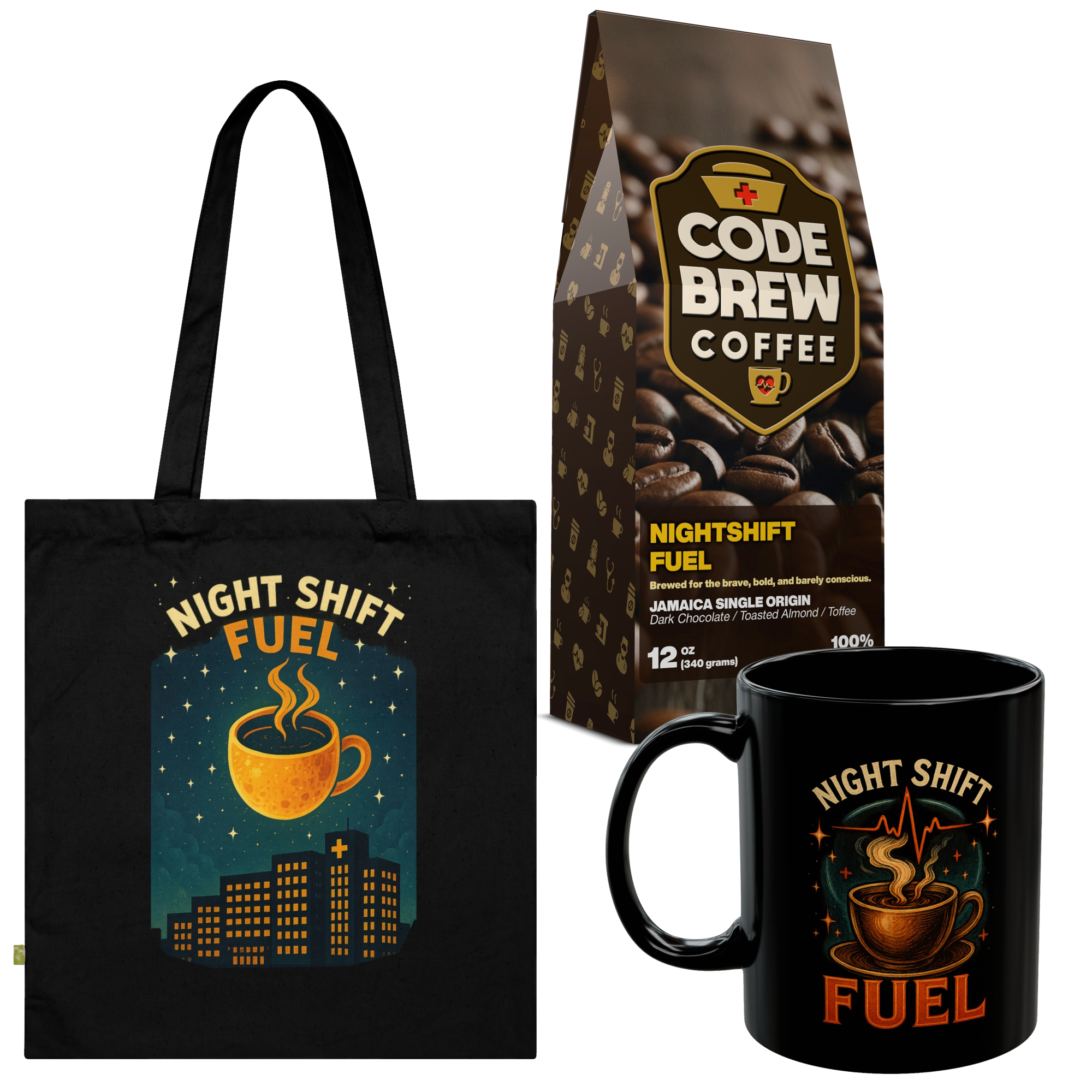 Pulling a night shift isn’t just a job — it’s an endurance test. This bundle gives you everything you need to survive (and maybe even laugh through) the chaos: bold coffee, a mug that gets it, and a tote that hauls it all.